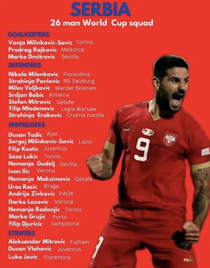 Rạng sáng 12/11 (giờ Hà Nội), tuyển Serbia công bố danh sách 26 cầu thủ dự World Cup 2022. Vua phá lưới mọi thời đại của tuyển Serbia, Aleksandar Mitrovic, được điền tên dù đang điều trị chấn thương mắt cá.