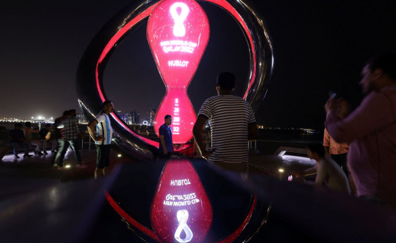 Fan hâm mộ chụp ảnh bên cạnh đồng hồ đếm ngược của World Cup tại Doha Corniche, Doha