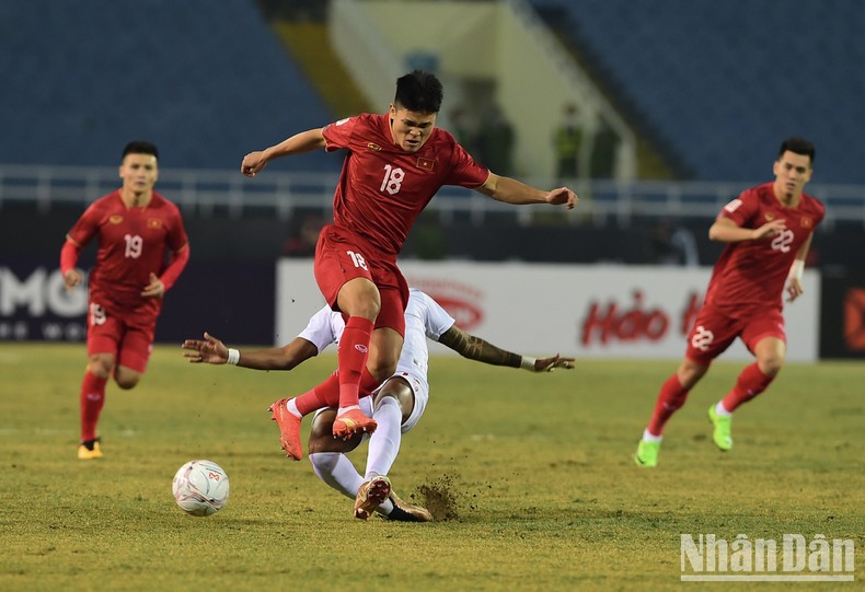 Đến phút thứ 8, Việt Nam tìm được bàn mở tỷ số. Từ đường chuyền của Hùng Dũng, Văn Hậu thả bóng để Văn Quyết trả ngược từ đáy và Tuấn Hải đã ghi bàn. Một bàn thắng thể hiện rõ nét khả năng luân chuyển bóng nhuần nhuyễn của tuyển Việt Nam.