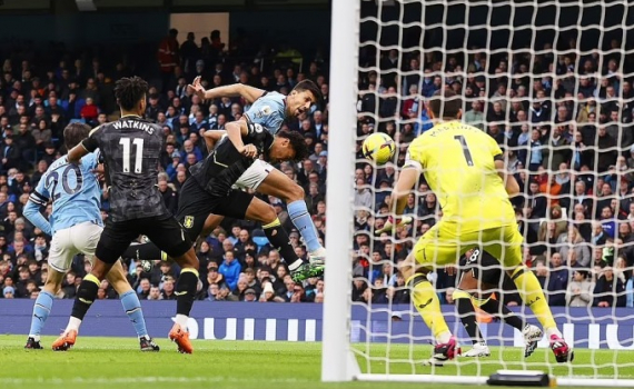 HLV và cầu thủ Man City không dao động tâm lý khi bước vào trận gặp Aston Villa, dù CLB vừa bị ban tổ chức giải cáo buộc phạm luật công bằng tài chính. Với sơ đồ tấn công 3-2-4-1, Man City tràn lên sớm và chỉ mất bốn phút để vượt lên. Từ quả phạt góc của Riyad Mahrez, Rodri đánh đầu vào góc gần mở tỷ số.