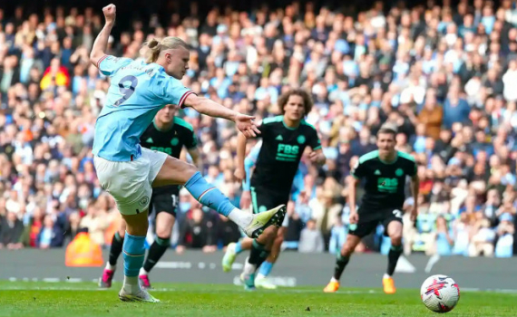 Haaland sút phạt đền nâng tỷ số lên 2-0 cho Man City trước Leicester trên sân Etihad, thành phố Manchester ở vòng 31 Ngoại hạng Anh ngày 15/4/2023.