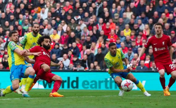 Mohamed Salah ghi bàn ấn định thắng lợi 3-2 cho Liverpool trước Nottingham trên sân Anfield, ở vòng 32 Ngoại hạng Anh ngày 22/4/2023.