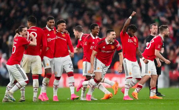 Cầu thủ Man Utd mừng chiến thắng trước Brighton ở loạt đá luân lưu bán kết Cup FA trên sân Wembley, thành phố London, Anh ngày 23/4/2023.