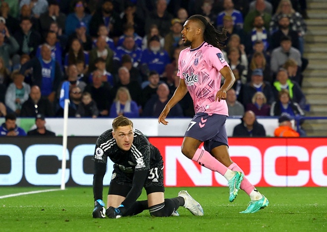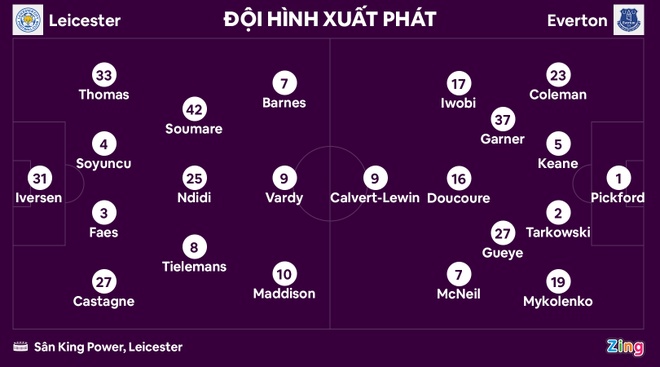 Phút 22, hàng thủ Everton lúng túng không biết kèm ai và để trung vệ Caglar Soyuncu thoải mái ngả người dứt điểm, gỡ hòa 1-1. Đến phút 33, Alex Iwobi chuyền ngang bất cẩn và để chủ nhà tổ chức phản công. Từ pha chọc khe của James Maddison, Jamie Vardy bứt tốc, dứt điểm nâng tỷ số lên 2-1.