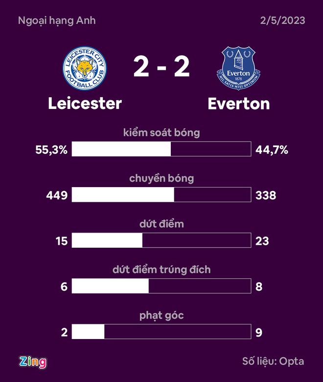 Tỷ số hòa 2-2 khiến Everton giậm chân ở vị trí thứ 19 trên bảng xếp hạng với 29 điểm sau 34 trận. Trong khi đó, Leicester vươn lên thứ 16 nhưng cũng chỉ hơn nhóm "cầm đèn đỏ" vỏn vẹn 1 điểm.