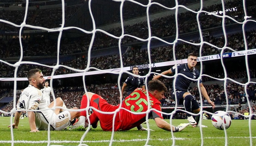 Trên sân Bernabeu hôm qua, Real gặp nhiều khó khăn trong hiệp đầu. Ngay phút 5, từ đường chuyền của Takefusa Kubo, Ander Barrenetxea sút hai cú liên tiếp trong vòng cấm để hạ thủ môn Kepa, mở tỷ số cho Sociedad. Barrenetxea ghi bàn thứ ba vào lưới Real - thông số cá nhân tốt nhất trước một đối thủ tại La Liga.