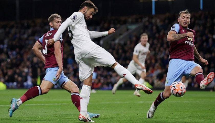 Fernandes (trắng) dứt điểm ghi bàn duy nhất cho Man Utd trên sân Turf Moor.