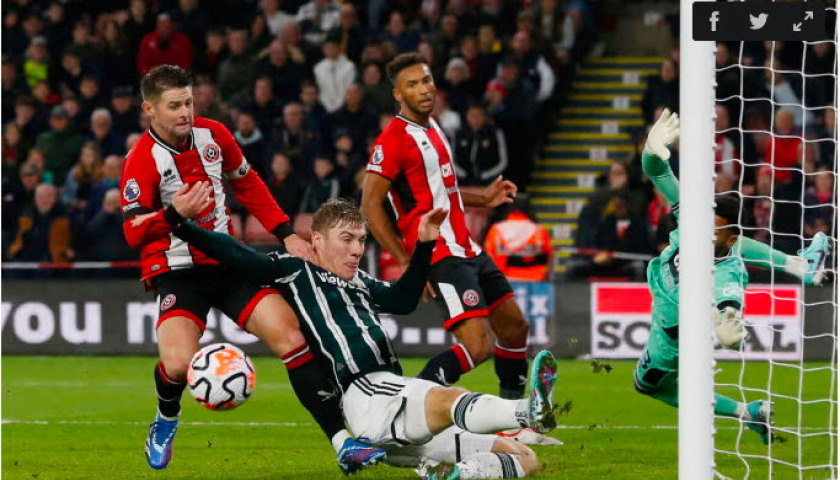 Trước đó, đoàn quân của Erik ten Hag phung phí loạt cơ hội khi tỷ số là 1-1. Lần lượt Bruno Fernandes đá phạt dội xà ngang trong hiệp một, đến Sofyan Amrabat sút xa rung chuyển xà ngang ở hiệp hai. Xen giữa hai tình huống này là một lần Rashford đệm chân trái chéo góc nhưng chệch cột trong gang tấc, và một lần Hojlund lao vào đệm hụt bóng trước cầu môn trống.