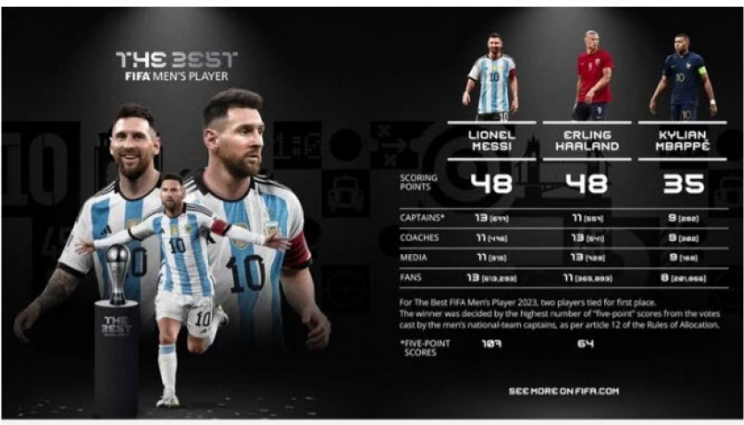 Theo kết quả bầu chọn được công bố từ FIFA, Lionel Messi và Erling Haaland cán đích với điểm số ngang nhau (48), trong khi Kylian Mbappe giành 35 điểm. Theo điều 12 của quy tắc bầu chọn, khi 2 cầu thủ bằng điểm, chỉ số phụ sẽ được tính đến, đó là phiếu từ các đội trưởng tuyển quốc gia trên toàn thế giới.