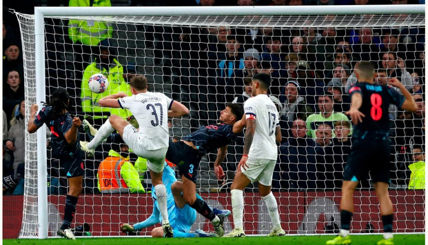 Phút 88, tiền vệ Kevin de Bruyne đá phạt góc từ bên trái thẳng về cầu môn, nơi trung vệ Ruben Dias đứng sát thủ môn Guglielmo Vicario để tranh bóng. Thủ thành Tottenham cố gắng đấm ra nhưng tác động từ Dias khiến bóng rơi ngay trước cầu môn, giúp Ake lao vào dễ dàng đạp bóng vào lưới trống. Trọng tài Paul Tierney công nhận bàn thắng cho Man City, còn VAR không can thiệp. Cầu thủ chủ nhà phản ứng nhưng không thay đổi được quyết định của trọng tài, trong khi Vicario còn phải nhận thẻ vàng.