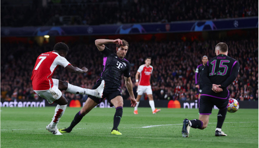 Saka (số 7) cứa lòng mở tỷ số ở trận gặp Bayern trên sân Emirates, Anh.