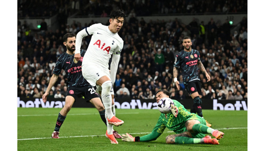 Thủ môn Ederson cản một pha dứt điểm của Son Heung-min ở trận Man City thắng Tottenham 2-0 tại Ngoại hạng Anh