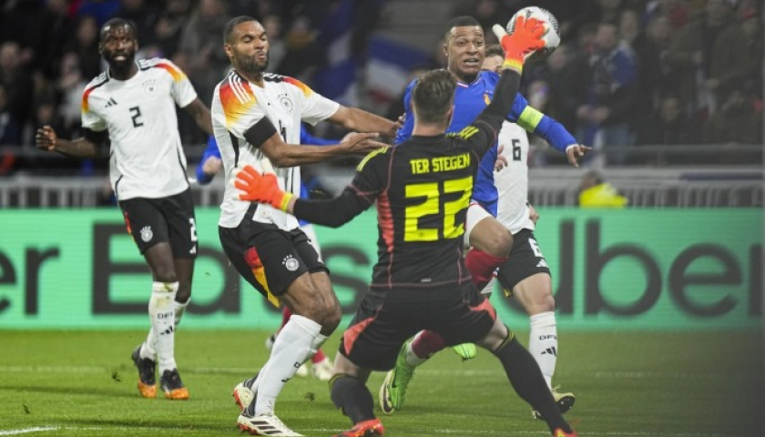 Thủ môn Ter Stegen cản một cú dứt điểm của Kylian Mbappe (áo xanh) trong trận giao hữu Đức thắng Pháp 2-0 trên sân Lyon ngày 23/3/2024. Ảnh: AP