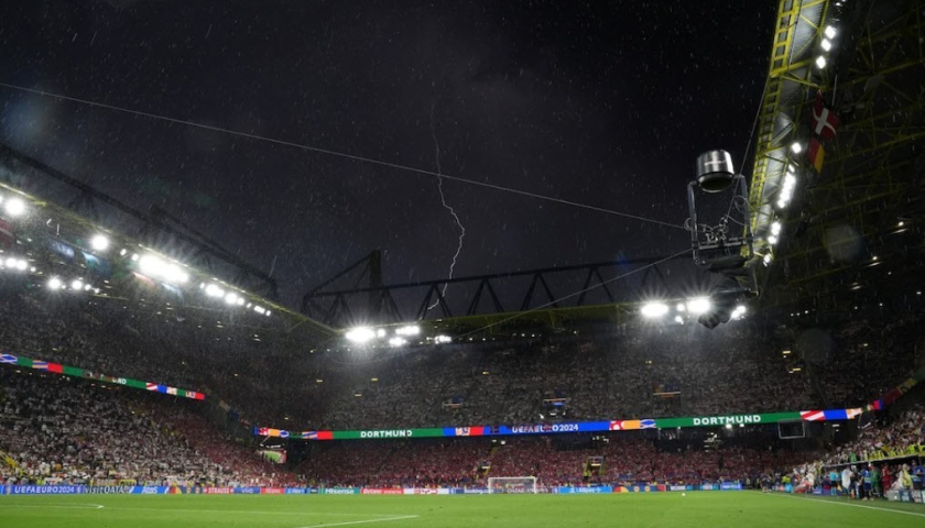 Tia chớp trên bầu trời sân Signal Iduna Park, Dortmund giữa trận Đức - Đan Mạch.