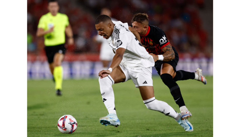 Tiền đạo Real Kylian Mbappe bị thủ môn Mallorca từ chối trong trận hòa 1-1 ở vòng 1 La Liga ngày 18/8 trên sân Son Moix, Mallorca.