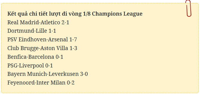 Kết quả chi tiết lượt đi vòng 1/8 Champions League