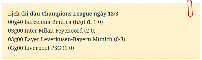 Còn ở loạt trận 3 giờ, Liverpool cũng có lợi thế dẫn 1-0 trước màn tiếp đón Paris Saint-Germain trên sân nhà Anfield.