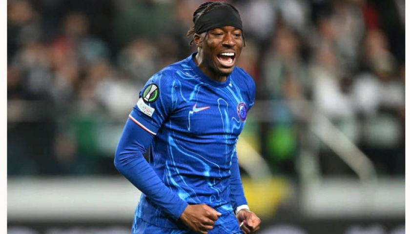 Tiền đạo cánh Noni Madueke mừng bàn nâng tỷ số lên 2-0 cho Chelsea trước Legia trên sân Wojska Polskiego, thành phố Warsaw, Ba Lan, lượt đi tứ kết UEFA Conference League tối 10/4/2025.