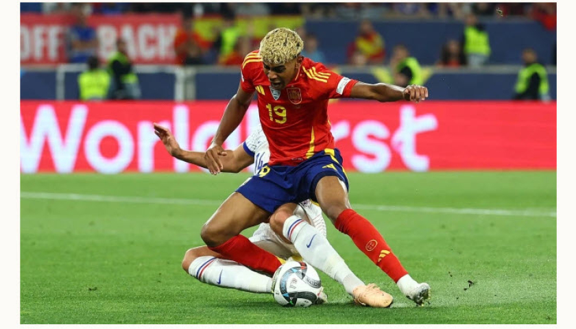 Nhưng đến phút 67, Porro chuộc lỗi với pha chuyền ngang kiến tạo cho Yamal thoát xuống bên phải cấm địa. Anh rướn người vượt qua Lenglet, rồi tỉa bóng chìm về góc xa. Maignan chạm được tay vào bóng nhưng vẫn không thể cứu thua. Sau bàn thắng này, Yamal ngồi trên tấm bảng quảng cáo, giống như Cristiano Ronaldo từng làm khi còn khoác áo Real Madrid. Đây là lần đầu tiên Pháp thủng lưới năm bàn trong một trận đấu, sau 56 năm.