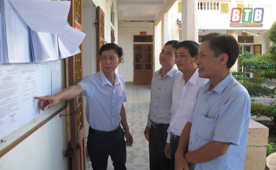 Cán bộ Phòng Nội vụ huyện Đông Hưng kiểm tra việc niêm yết danh sách cử tri và các văn bản liên quan đến bầu cử trưởng thôn tại xã Đông Xá.