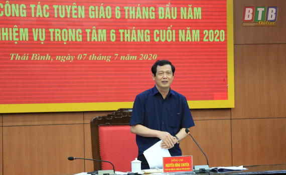 Kết luận hội nghị, đồng chí Trưởng ban Tuyên giáo Tỉnh ủy đề nghị trong thời gian tới ban tuyên giáo các cấp, các ngành, đơn vị đẩy mạnh công tác tuyên truyền việc thực hiện nghị quyết đại hội đảng bộ các cấp, trong đó tập trung tuyên truyền về các nhiệm vụ, giải pháp cụ thể để thực hiện thắng lợi các mục tiêu, chỉ tiêu đề ra. Tập trung tuyên truyền kết quả phát triển kinh tế - xã hội 6 tháng đầu năm, nhiệm vụ, giải pháp 6 tháng cuối năm 2020. Tuyên truyền về các ngày lễ, kỷ niệm, các sự kiện chính trị quan trọng của đất nước, của tỉnh. Tập trung nắm tình hình tư tưởng cán bộ, đảng viên và các tầng lớp nhân dân trước thềm Đại hội đại biểu Đảng bộ tỉnh lần thứ XX. Tăng cường phối hợp giữa các ngành, đơn vị trong khối khoa giáo, khối lý luận chính trị, khối tư tưởng - văn hóa và lĩnh vực an ninh tư tưởng - văn hóa trong triển khai thực hiện các nhiệm vụ công tác tuyên giáo. Các ngành, các địa phương, đơn vị, đặc biệt là lực lượng công an, quân sự, biên phòng làm tốt công tác phối hợp để bảo vệ vững chắc nền tảng tư tưởng của Đảng thông qua việc đấu tranh chống âm mưu “diễn biến hòa bình” của các thế lực thù địch; đấu tranh, phản bác các quan điểm sai trái, thù địch, thông tin xấu độc trên mạng xã hội; làm tốt công tác thông tin, tuyên truyền, quảng bá về hình ảnh đất và người Thái Bình từ đó tăng cường thu hút đầu tư vào tỉnh, đặc biệt là thu hút đầu tư vào Khu kinh tế Thái Bình. Tiếp tục tuyên truyền sâu rộng việc học tập và làm theo tư tưởng, đạo đức, phong cách và những lời dạy của Chủ tịch Hồ Chí Minh.