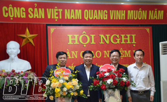 Đồng chí Nguyễn Quang Hưng, Ủy viên Ban Thường vụ Tỉnh ủy, Phó Chủ tịch thường trực UBND tỉnh tặng hoa chúc mừng đồng chí Nguyễn Văn Bái và đồng chí Phạm Quang Hòa.