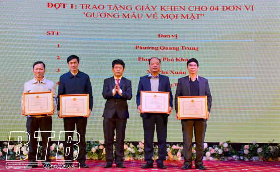 Đồng chí Hoàng Văn Thành, Ủy viên Ban Thường vụ Tỉnh ủy, Bí Thành ủy tặng giấy khen cho các tập thể gương mẫu về mọi mặt.
