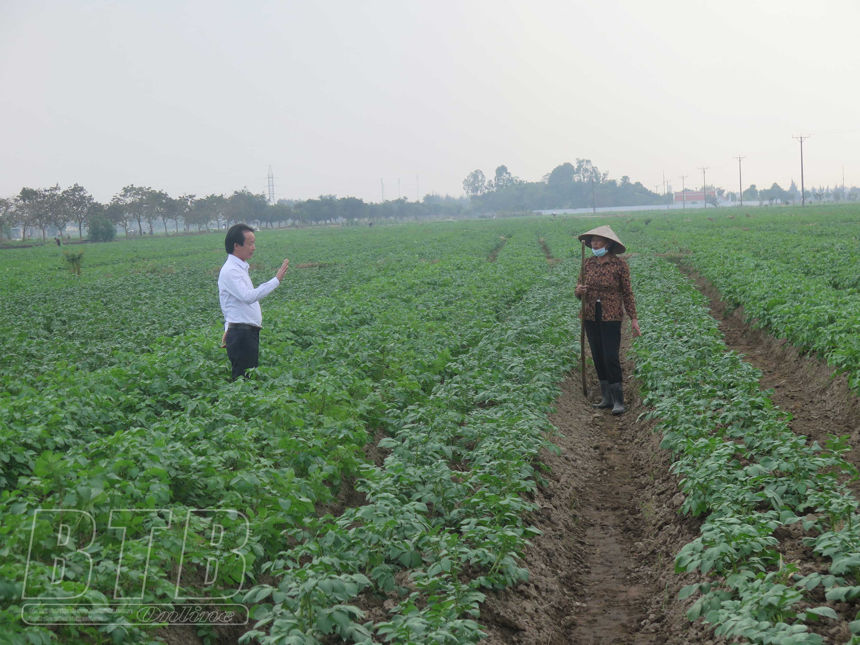 Lãnh đạo HTX SXKD DVNN xã Vũ An trao đổi kỹ thuật chăm sóc cây khoai tây với người dân.