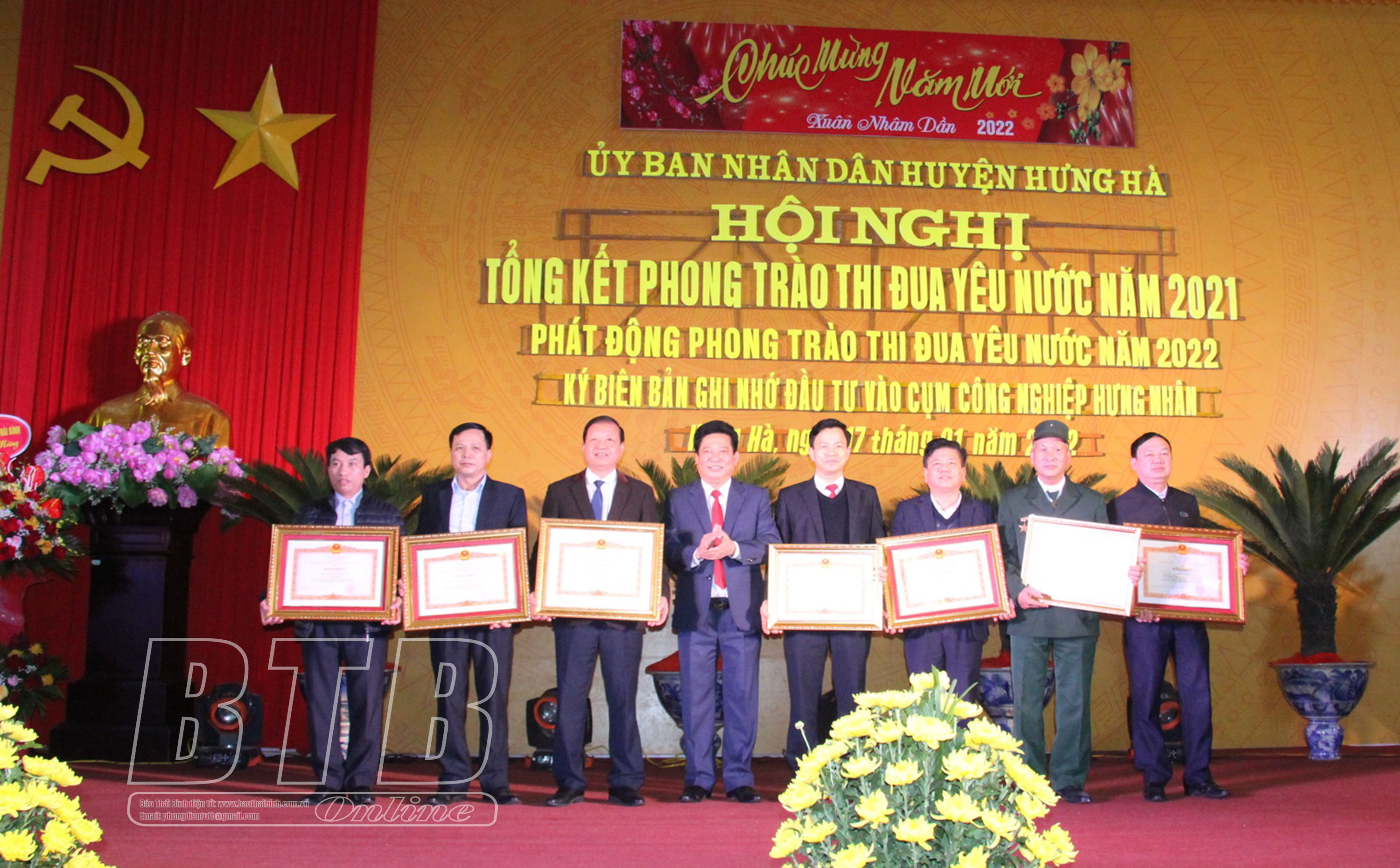 Lãnh đạo huyện Hưng Hà trao bằng khen của Thủ tướng Chính phủ cho các tập thể, cá nhân có thành tích xuất sắc trong phong trào thi đua năm 2021.