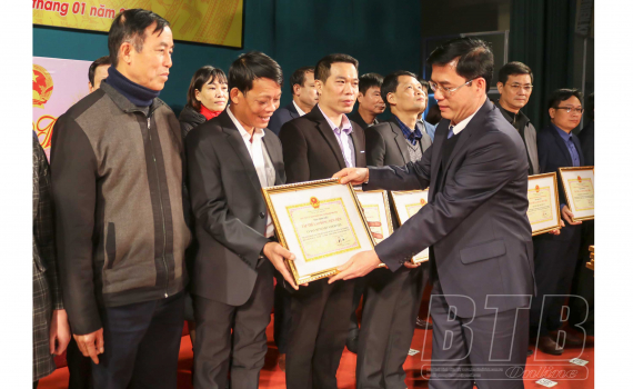 Đồng chí Nguyễn Tiến Quyền, Phó Bí thư Huyện ủy, Chủ tịch UBND huyện Quỳnh Phụ trao thưởng cho các tập thể, cá nhân có nhiều thành tích trong phong trào thi đua yêu nước năm 2021.