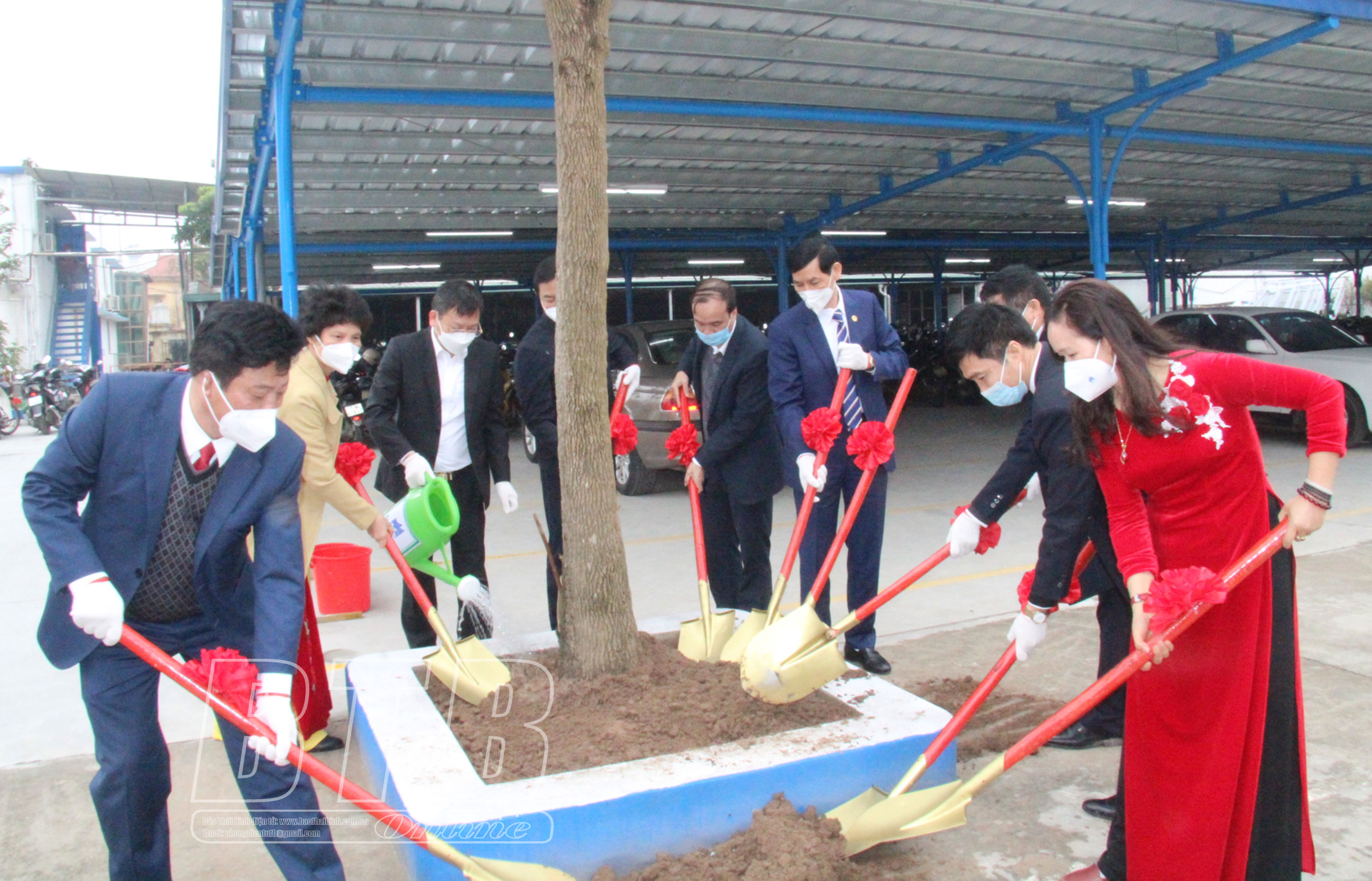 Các đại biểu trồng cây lưu niệm tại Xí nghiệp May Hưng Hà (Tổng công ty May 10).