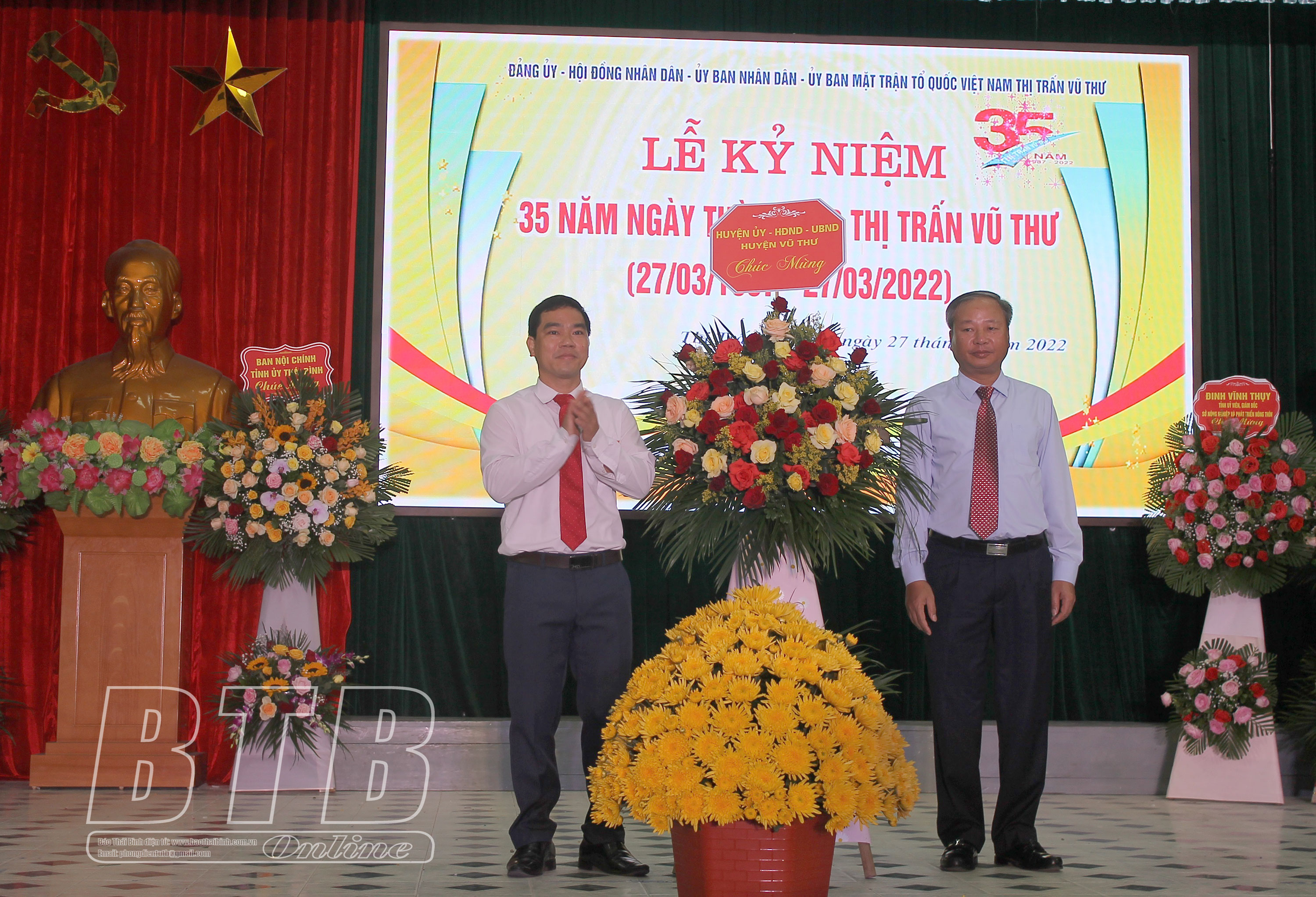 Lãnh đạo Huyện ủy Vũ Thư tặng hoa chúc mừng Đảng bộ, chính quyền, nhân dân thị trấn Vũ Thư nhân dịp 35 năm thành lập.