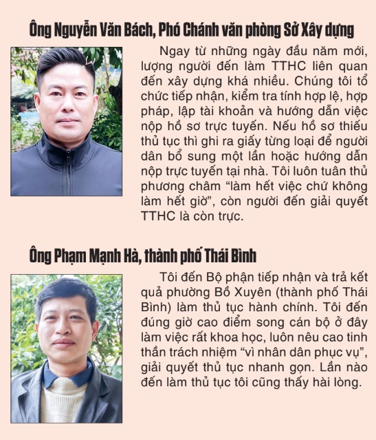 Ông Phạm Đình Kiền, xã Quỳnh Minh (Quỳnh Phụ) chia sẻ: Tôi đến Trung tâm làm thủ tục đăng ký đổi tên đơn vị, được cán bộ ở đây tiếp đón niềm nở, hướng dẫn rất nhiệt tình, chỉ mất vài phút là tôi nộp xong hồ sơ trực tuyến, 3 ngày sau sẽ có kết quả. Cán bộ ở đây còn hướng dẫn tôi cách theo dõi tiến độ giải quyết TTHC trên Cổng dịch vụ công quốc gia. Tôi rất hài lòng vì việc lớn đầu xuân mới diễn ra hanh thông, thuận lợi.
