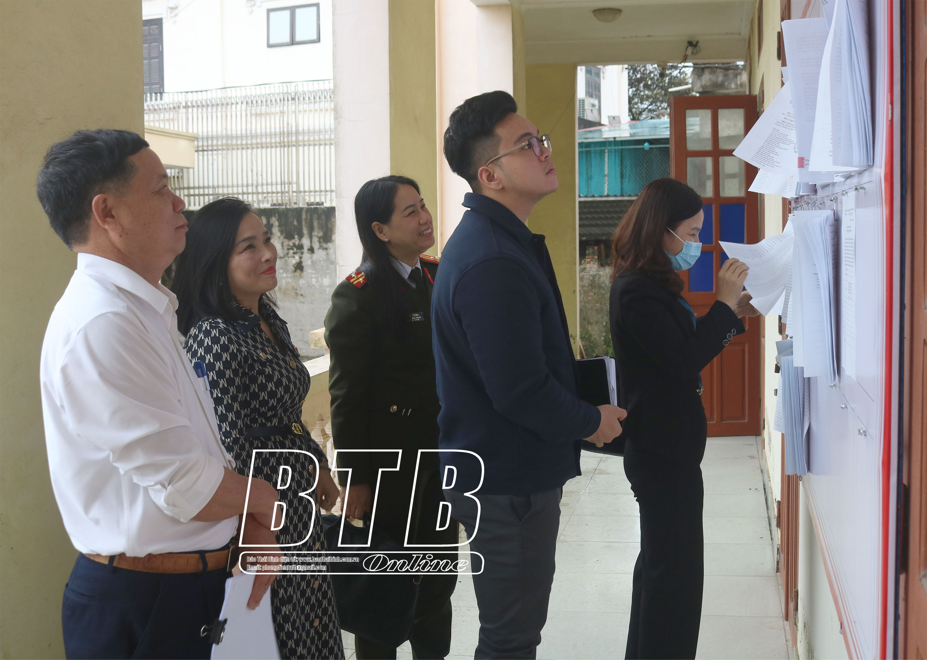 Thành viên đoàn kiểm tra kiểm tra việc niêm yết danh sách cử tri tại xã Điệp Nông (Hưng Hà).