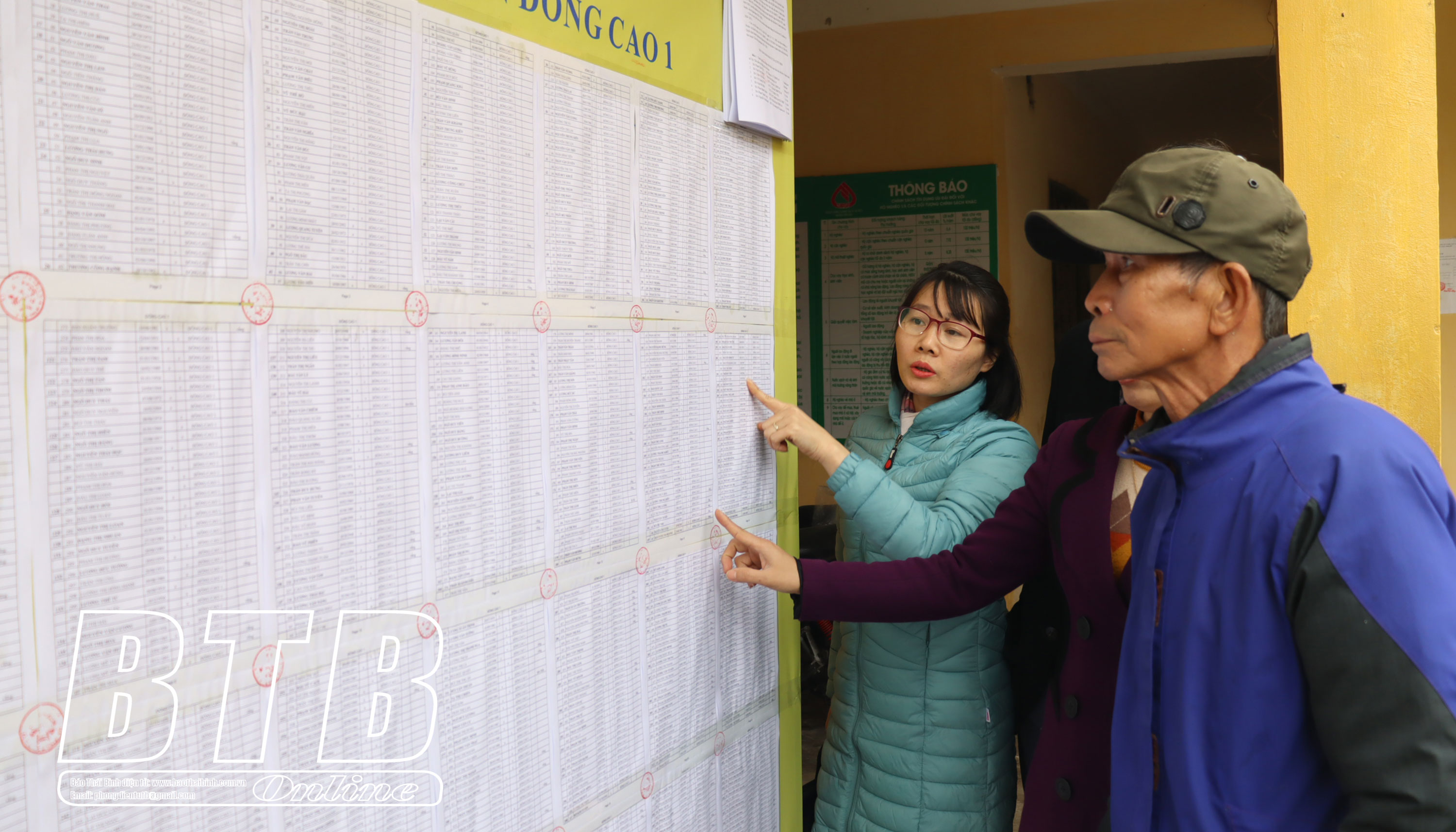 Người dân xã Tây Tiến (Tiền Hải) theo dõi danh sách cử tri được niêm yết công khai tại trụ sở UBND xã.