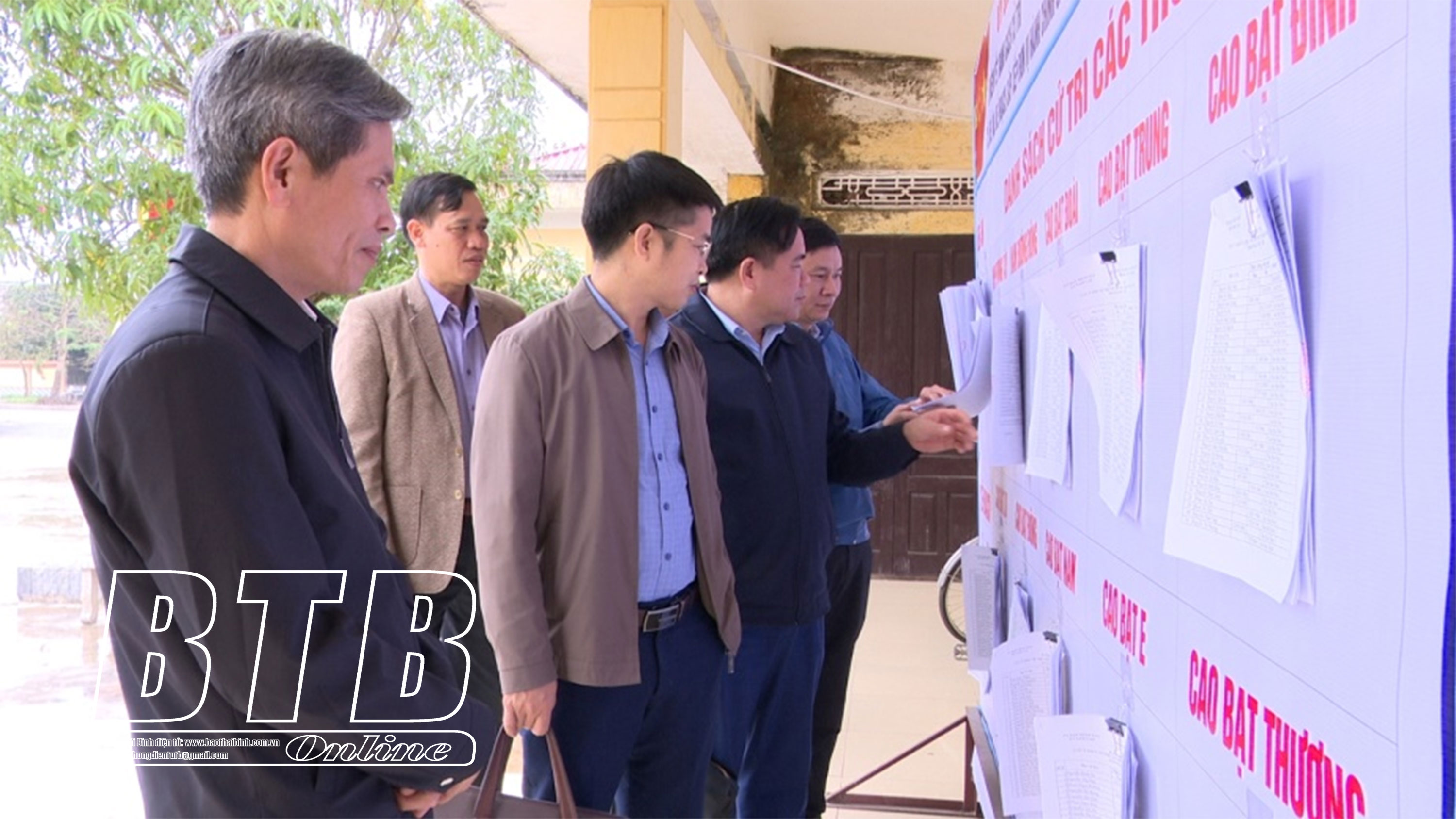 Các đồng chí lãnh đạo huyện Kiến Xương kiểm tra việc niêm yết danh sách cử tri tại xã Nam Cao.