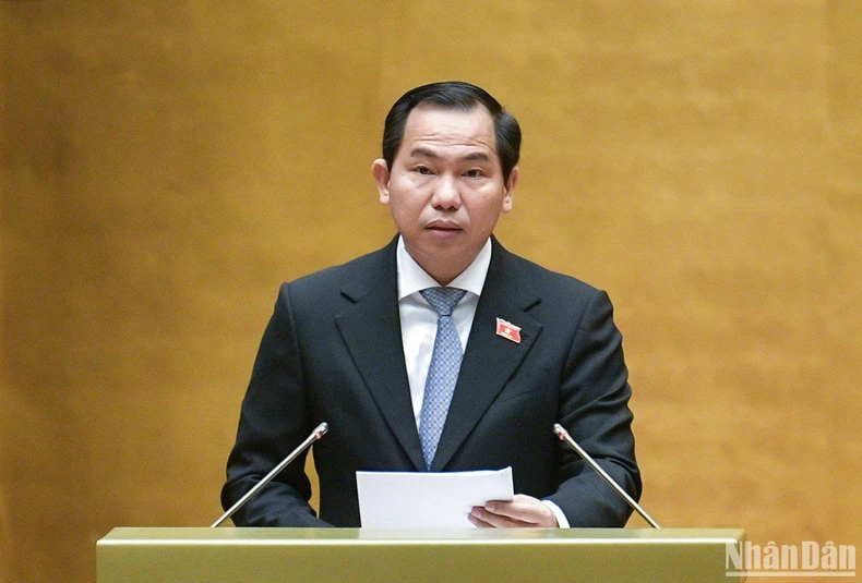 Chủ nhiệm Ủy ban Tài chính, Ngân sách Lê Quang Mạnh, Phó Trưởng đoàn Thường trực Đoàn giám sát báo cáo tóm tắt kết quả giám sát việc thực hiện Nghị quyết số 43. (Ảnh: DUY LINH).