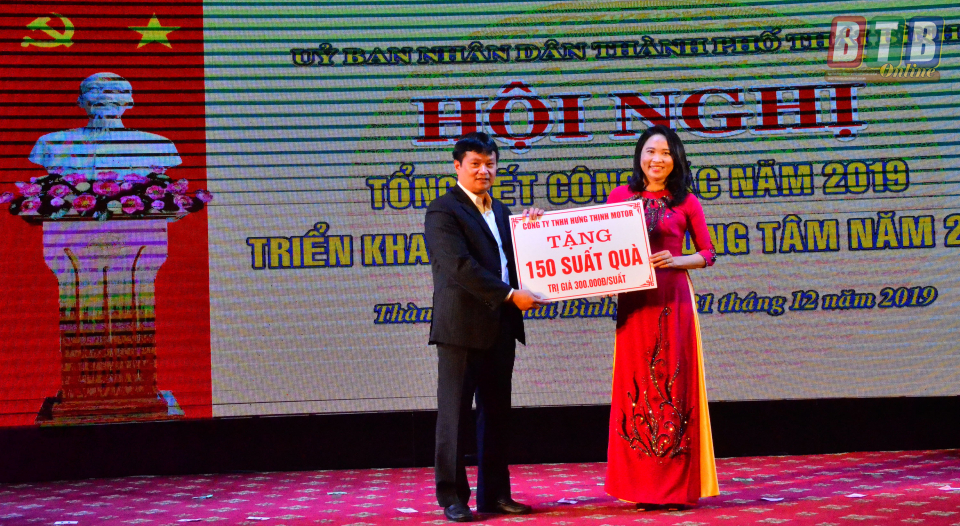 Lãnh đạo UBND thành phố tiếp nhận quà ủng hộ người nghèo đón Tết Nguyên đán Canh Tý 2020 từ doanh nghiệp.