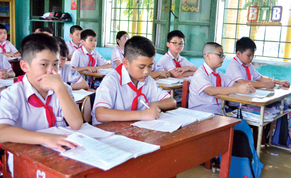 Em Phạm Tiến Gia Phát (ngồi bàn đầu tiên, thứ hai từ trái sang) Trường Tiểu học thị trấn Quỳnh Côi (Quỳnh Phụ) trong giờ học trên lớp.