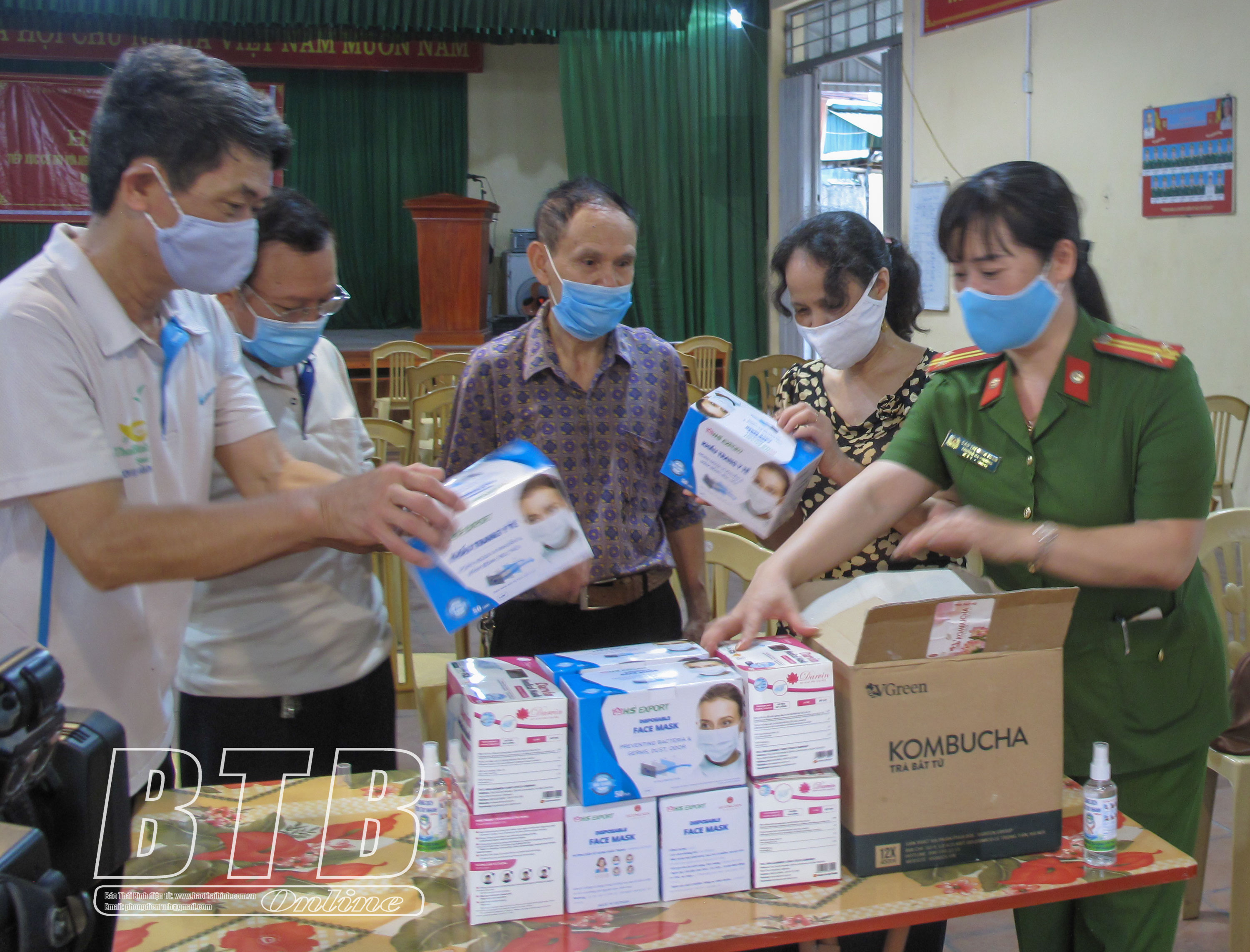 Trung tá Cao Thị Minh Toàn, Trưởng Công an phường Trần Hưng Đạo (thành phố Thái Bình) tặng khẩu trang phòng, chống dịch Covid-19 cho tổ bầu cử khu vực bỏ phiếu số 5, phường Trần Hưng Đạo.