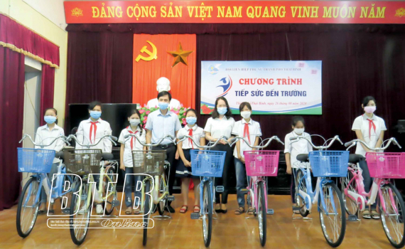 Các em học sinh nhận xe đạp tại chương trình tiếp sức đến trường do Hội Liên hiệp Phụ nữ thành phố tổ chức. Ảnh tư liệu