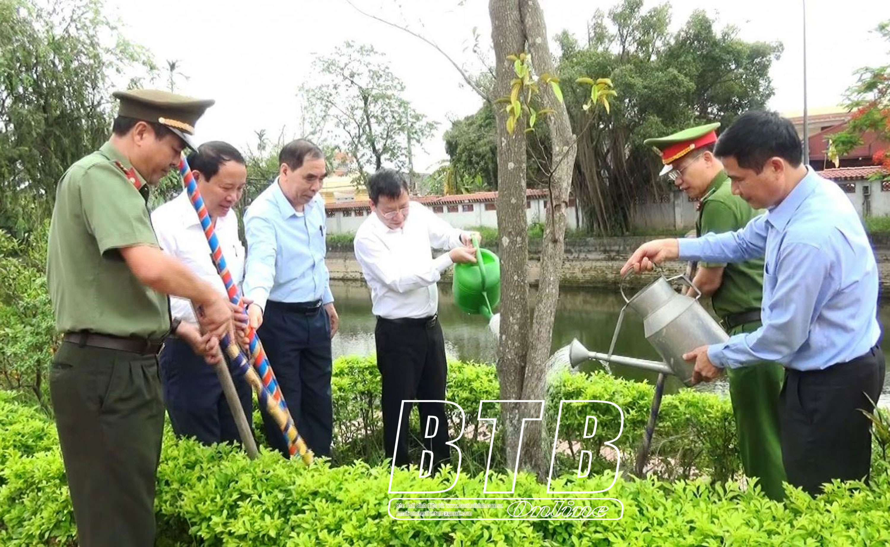 Các đồng chí lãnh đạo huyện Hưng Hà trồng cây lưu niệm tại Đền thờ Bác Hồ (xã Hồng An).