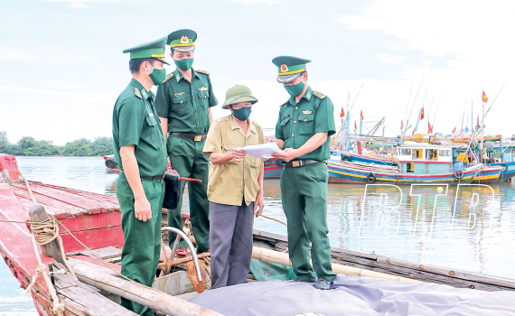 Cán bộ, chiến sĩ Đồn Biên phòng Cửa Lân vận động nhân dân ký cam kết chấp hành nghiêm các quy định của pháp luật về khai thác thủy sản trên biển.