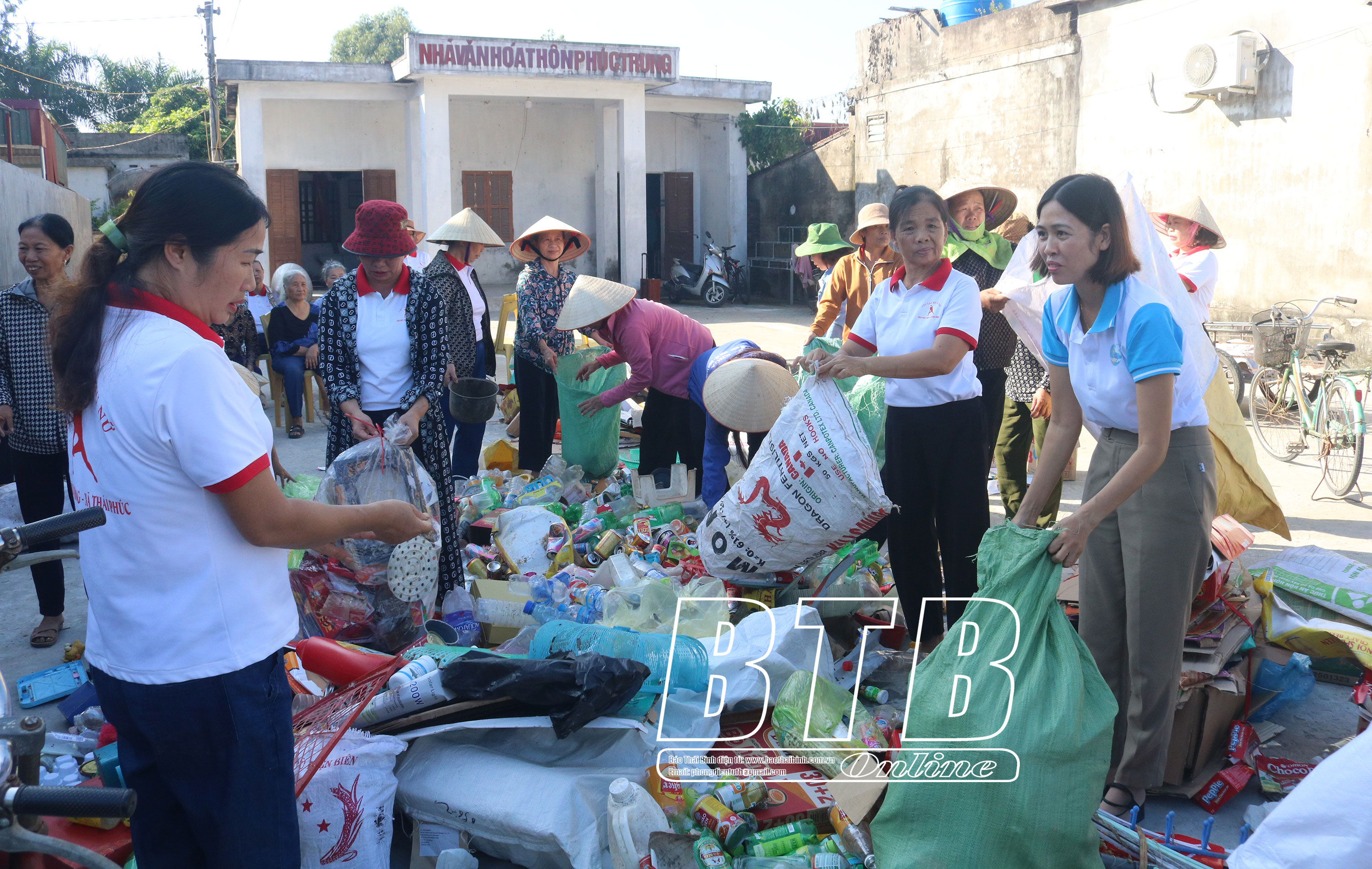 Chị em phụ nữ thôn Phúc Trung, xã Thái Phúc (Thái Thụy) phân loại rác để bán gây quỹ hội.