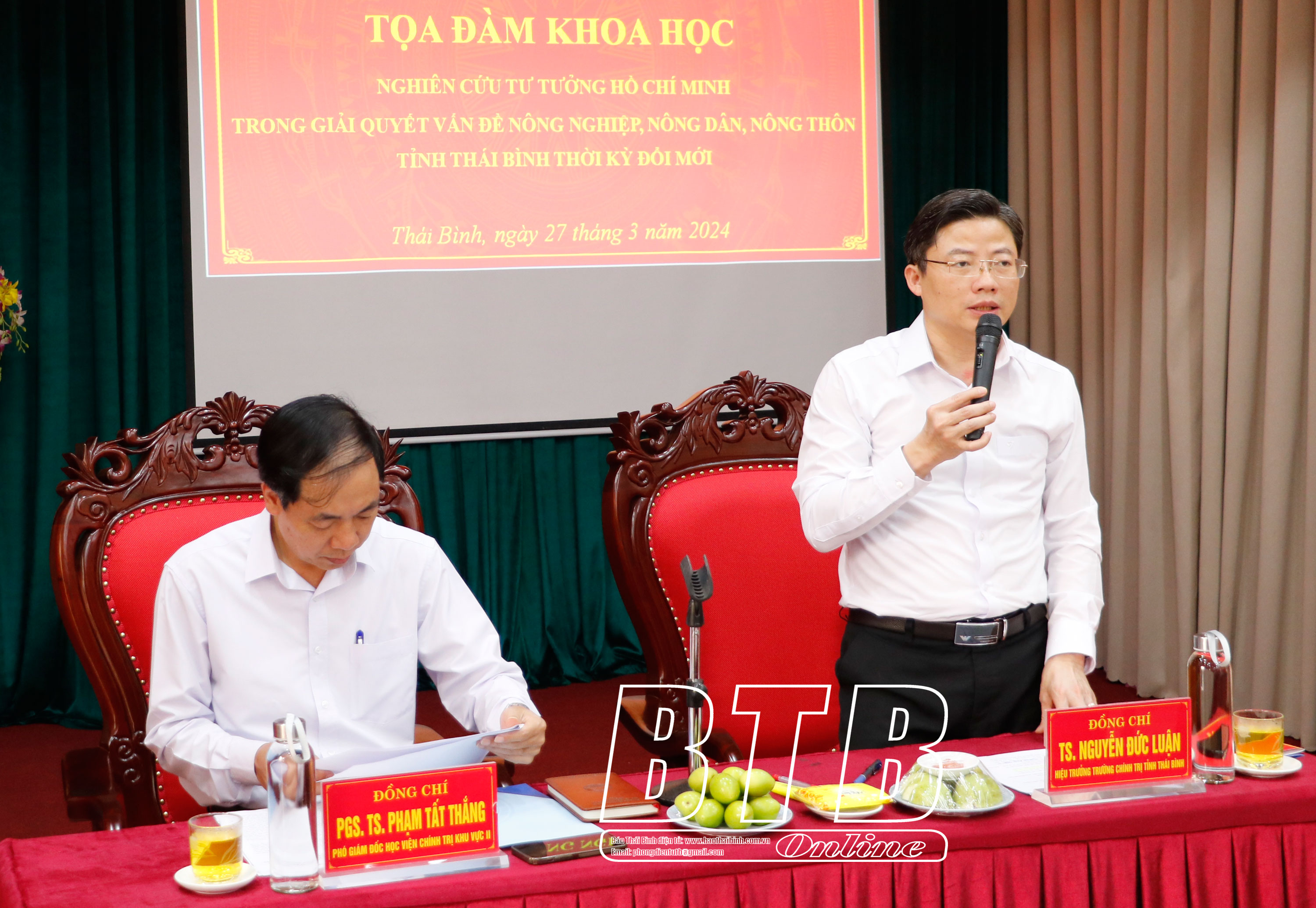 Tại buổi tọa đàm, các đại biểu đã thảo luận về các nội dung: Nghiên cứu, vận dụng và phát triển sáng tạo tư tưởng Hồ Chí Minh trong giải quyết các vấn đề nông nghiệp, nông dân, nông thôn tỉnh Thái Bình trong thời kỳ đổi mới; những chủ trương, nghị quyết, chương trình, kế hoạch của Tỉnh ủy, UBND tỉnh trong giải quyết các vấn đề nông nghiệp, nông dân, nông thôn từ năm 1986 đến nay; kết quả đạt được và những hạn chế, khó khăn đặt ra trong quá trình giải quyết các vấn đề; công tác dân vận trong xây dựng nông thôn mới ở tỉnh Thái Bình; những kết quả nghiên cứu khoa học về vấn đề nông nghiệp, nông dân, nông thôn và kết quả hoạt động đào tạo, bồi dưỡng cán bộ phục vụ sự nghiệp xây dựng nông nghiệp, nông dân, nông thôn trên địa bàn tỉnh.