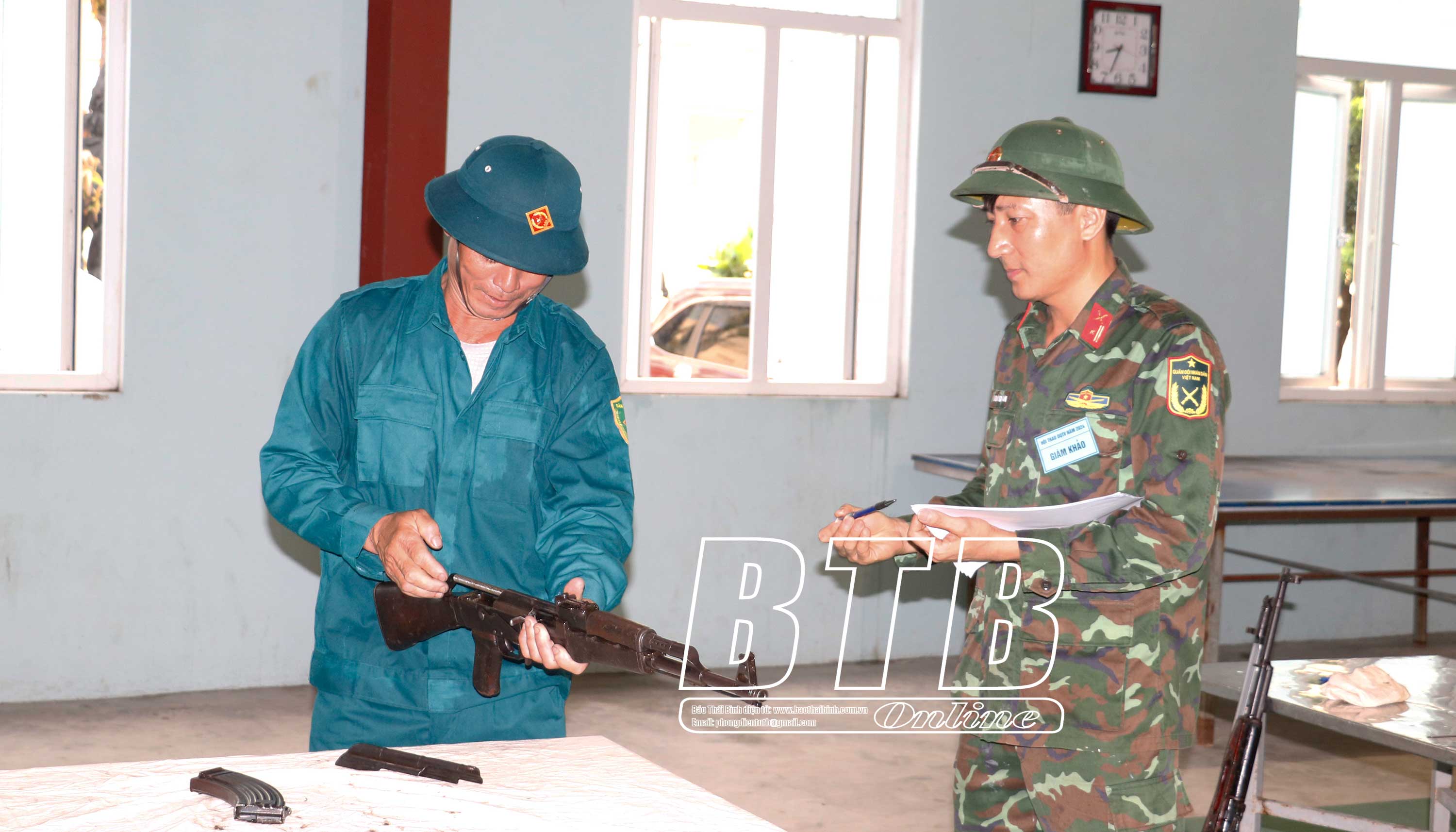 Chiến sĩ dân quân được cán bộ của Ban Chỉ huy Quân sự huyện Tiền Hải hướng dẫn kỹ thuật tháo lắp súng.