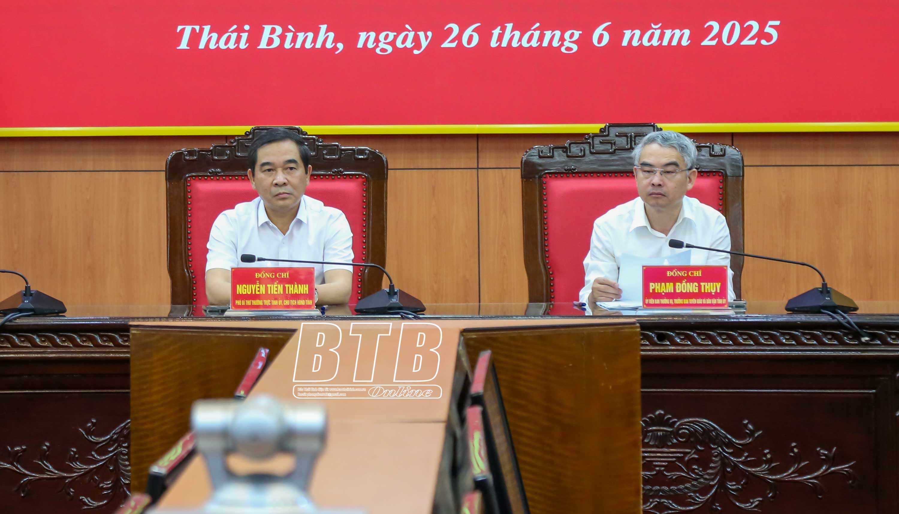 Các đồng chí: Nguyễn Tiến Thành, Phó Bí thư thường trực Tỉnh ủy, Chủ tịch HĐND tỉnh; Phạm Đồng Thụy, Ủy viên Ban Thường vụ, Trưởng ban Tuyên giáo và Dân vận Tỉnh ủy chủ trì hội nghị.