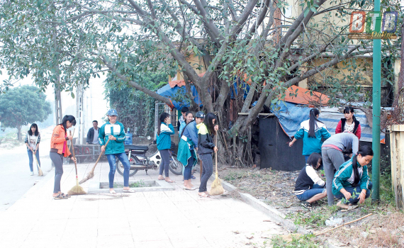 Học sinh Trường THCS Nguyên Xá (Đông Hưng) tham gia vệ sinh môi trường.