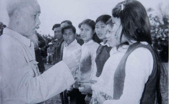 Chủ tịch Hồ Chí Minh thưởng Huy hiệu cho các chiến sĩ thi đua và lao động tiên tiến xã Nam Cường, huyện Tiền Hải, ngày 26/3/1962. Ảnh tư liệu