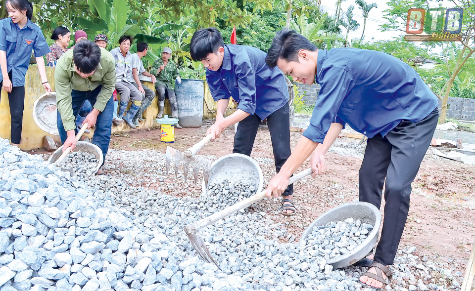 Đoàn viên thanh niên xã Trà Giang (Kiến Xương) tham gia xây dựng sân chơi cho thiếu nhi.